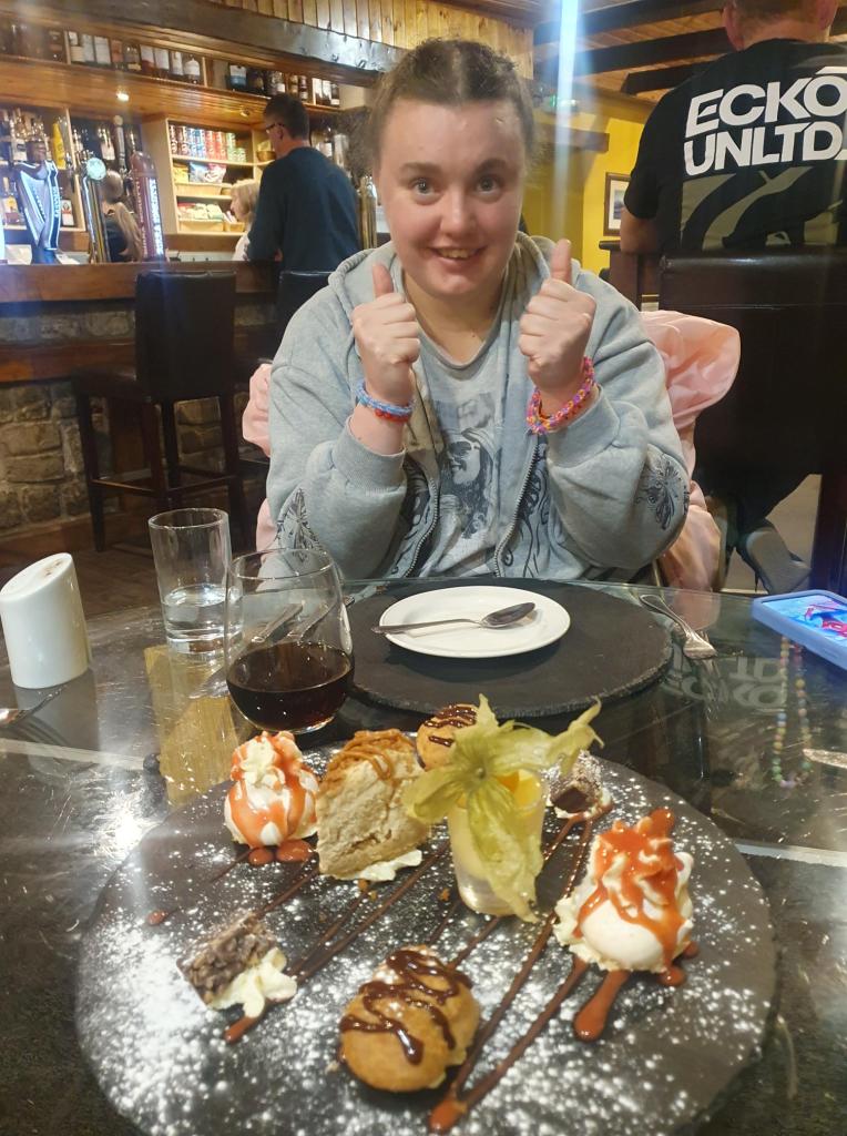 How cute is this? B and her sister’s shared the platter which consisted of a selection of mini profiteroles, meringues, biscoff cheesecake, lemon posset and brownies. I may have stolen the lemon posset which was delicious. The girls devoured the treats between them and all gave a green light.